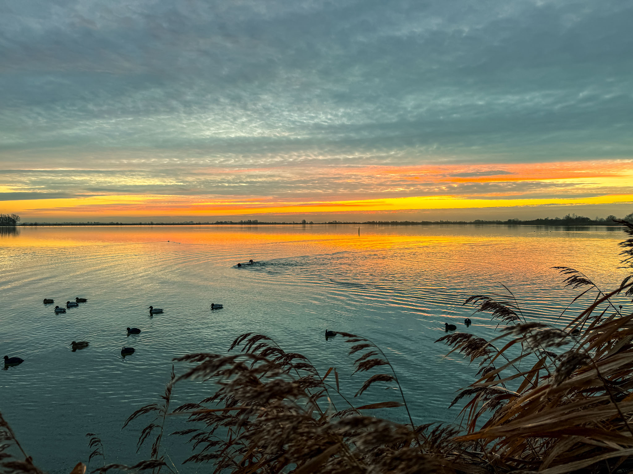 Grijze wolken wisselen elkaar snel af. Het is een frisse nacht geweest. Iets na achten verdwijnt de duisternis langzaam uit de lucht. Via een bruggetje verlaat ik het park en wandel over een onverhard pad in een paar minuten richting de Reeuwijkse Plassen. Een groepje meerkoetjes dobbert ontspannen op het water. Boven hen ontvouwt zich een waar schouwspel. De hemel kleurt oranje, geel en paars. Het zachte ochtendlicht weerkaatst op twee mannen die ondanks de kille temperaturen ongestoord baantjes trekken. Zomaar een ochtend in december aan de Reeuwijkse Plassen.